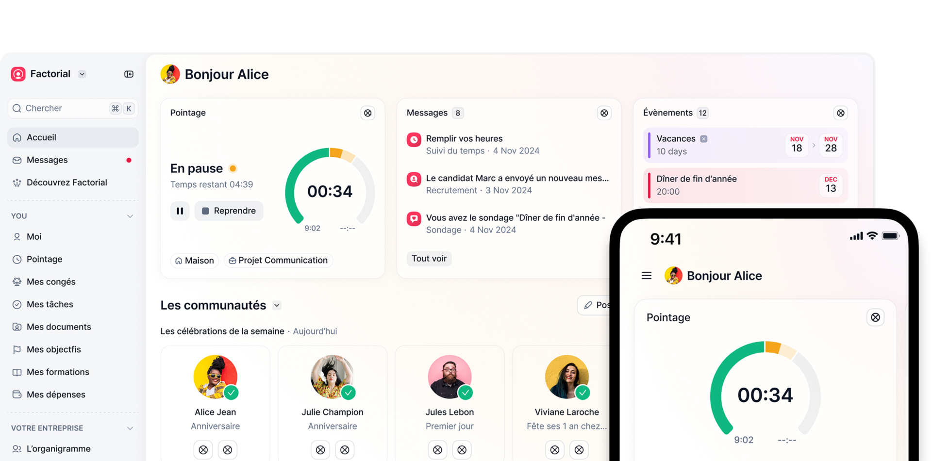 Factorial automatise les processus RH : congés, paie, notes de frais, pour vous libérer du temps et recentrer vos efforts sur la croissance de vos équipes.